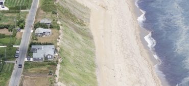 Perched precariously at the edge of the Sconset Bluff above the controversial geotube installation, the house called “Swept Away” at 93 Baxter Road stands…