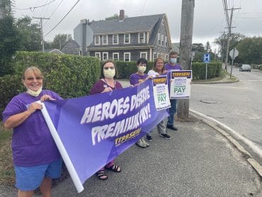 A group of Nantucket Cottage Hospital staff members rallied at the Four Corners intersection yesterday calling for “Pandemic Pay” bonuses from the state legislature,…